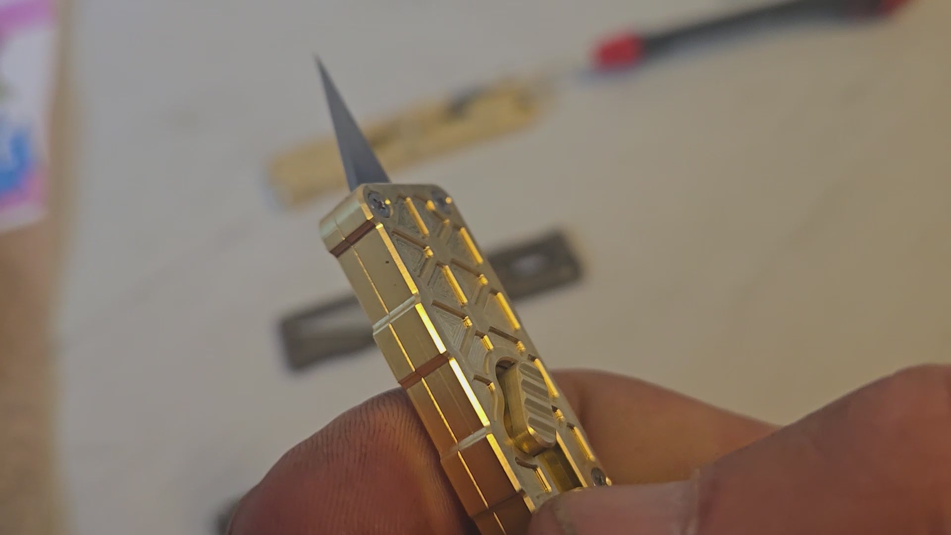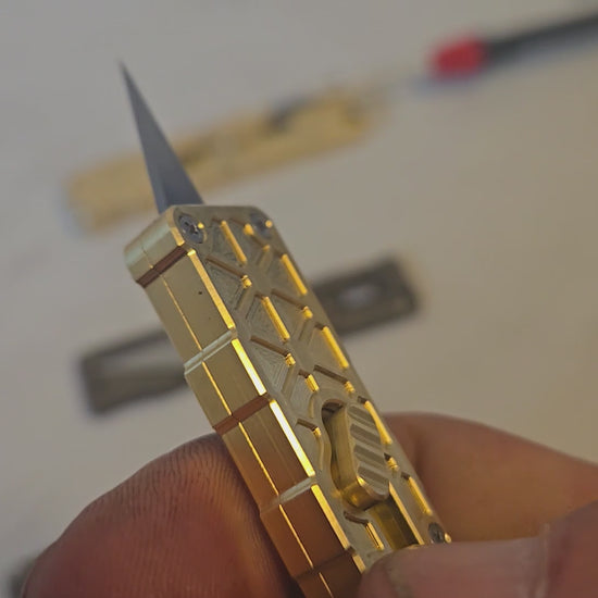 The skookum frame and blade lock mechanics are machined out of 360 Brass to fit industry standard X-Acto brand X-11 blades.